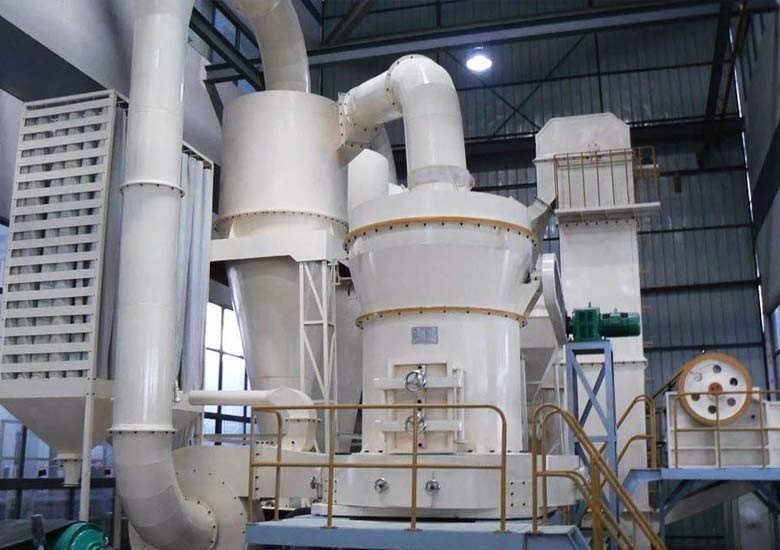 物料经颚式破碎机破碎后由斗式提升机送至储料仓,电磁振动给料机可以把物料均匀、连续地送到主机进行研磨。研磨后的粉末在鼓风机的作用下吹向选粉机进行分选。分选后的物料由管道送到储料仓,最后经出料阀输出即为成品。整套生产线工作过程中气压为负。首先,鼓风机吹出的空气伴随着粉末物料经管道进入储料仓上部的旋风收集器内,由回风管道返回鼓风机,形成空气循环利用。其次,集粉器下端装有锁粉器,其作用是将外界正压气体与集粉器负压气体隔离开,大大提高了产量。然后,主机底部残留的空气和粉尘通过管道被送到布袋除尘器进行过滤,粉尘等杂物被布袋除尘器吸附,净化后的空气排放到外界,有效地保护了环境。