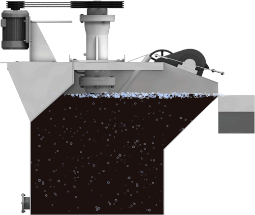 将磨碎的矿石,在磨碎时或磨碎后加水及必要的药剂经搅拌槽调成矿浆后,注入开始搅拌的矿浆槽,向矿浆中导入空气,使其形成大量气泡 ,一些不易被水湿润的,即一般称作疏水性的矿物粒子附着于气泡上,并与气泡一起浮到矿浆表面,形成矿化气泡层,另一些容易被水湿润的,即一般称做亲水性的矿物粒子不附着于气泡上,而留在矿浆中,将含有特定矿物的矿化气泡排出,从而达到选矿的目的。