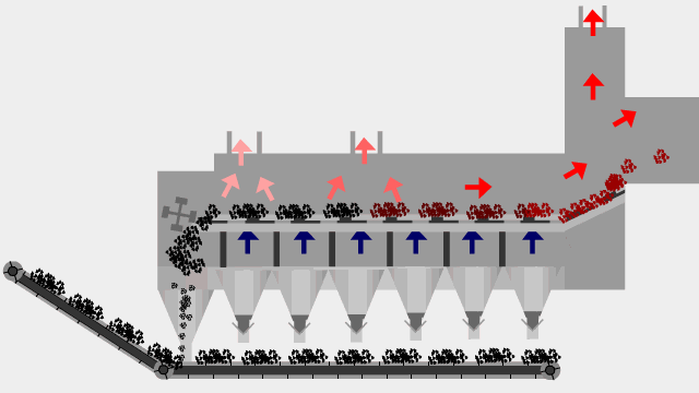 回转窑主要结构由窑头、窑尾、筒体、支承装置、电机、驱动装置等组成。其中,支承装置为3组托辊,窑尾设有扩大带,筒体内衬由高铝砖和镁铬砖砌筑。 回转窑是一个有一定斜度的圆筒状物,斜度为3~3.5%,借助窑的转动来促进料在回转窑内搅拌,使料互相混合、接触进行反应。窑头喷煤燃烧产生大量的热,热量以火焰的辐射、热气的对流、窑砖传导等方式传给物料。物料依靠窑筒体的斜度及窑的转动在窑内向前运动。