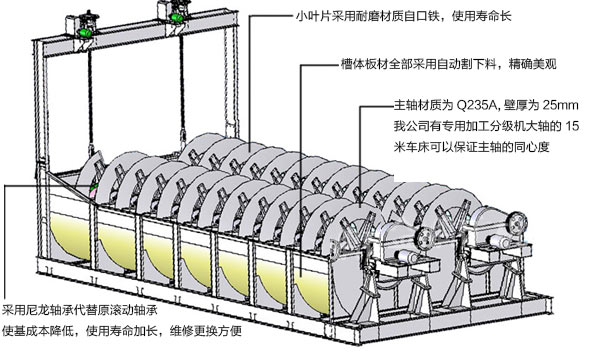 螺旋分级机是借助于固体粒大小不同,比重不同,因而在液体中的沉降速度不同的原理,细矿粒浮游在水中成溢流出,粗矿粒沉于槽底。由螺旋推向上部排出,来进行机械分级的一种分级设备,能把磨机内磨出的料粉级于过滤,然后把粗料利用螺旋片旋片旋入磨机进料口,把过滤出的细料从溢流管子排出。该机底座采用槽钢,机体采用钢板焊接而成。螺旋轴的入水头、轴头、采用生铁套,耐磨耐用,提升装置分电动和手动两种。